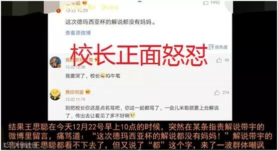 结果王思聪在一天指责解说带宇的网友留言中,发言,“德杯的解说都没有妈妈。”他这一个都字,引起了一阵舆论热潮,网友们纷纷评论嘲讽。小编认为王思聪这是有故意夸大这件事情的意向,本来是一件并不大的事情,结果闹得沸沸扬扬。还在网上引起热议,这下不仅带宇会遭到炮轰,王校长可能也会受到网友的批评。