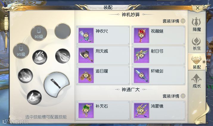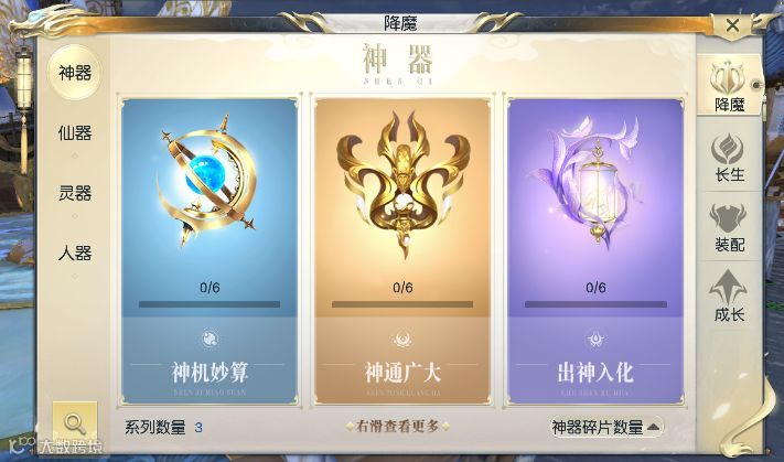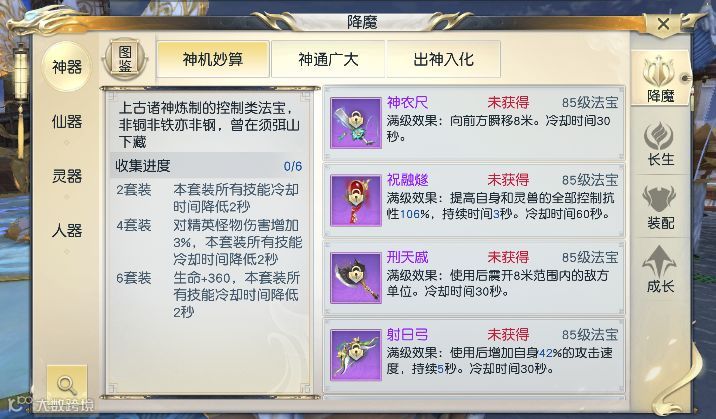 法宝系统会在玩家等级85级时解锁,随着等级提升,分别会在85级、90级、95级解锁三个法宝技能位,所以等级还没达标的小伙伴可要抓紧时间火速升级哦!游戏中法宝分为7个大类,分别为神器、仙器、灵器、人器、妖器、魔器、鬼器,每个大类下有分有不同的系列,如神器下面就分为“神机妙算”“神通广大”“出神入化”三大系列。每个系列内又含有不同数量的法宝,当玩家搜集齐对应数量的法宝还能产生套装加成的效果。