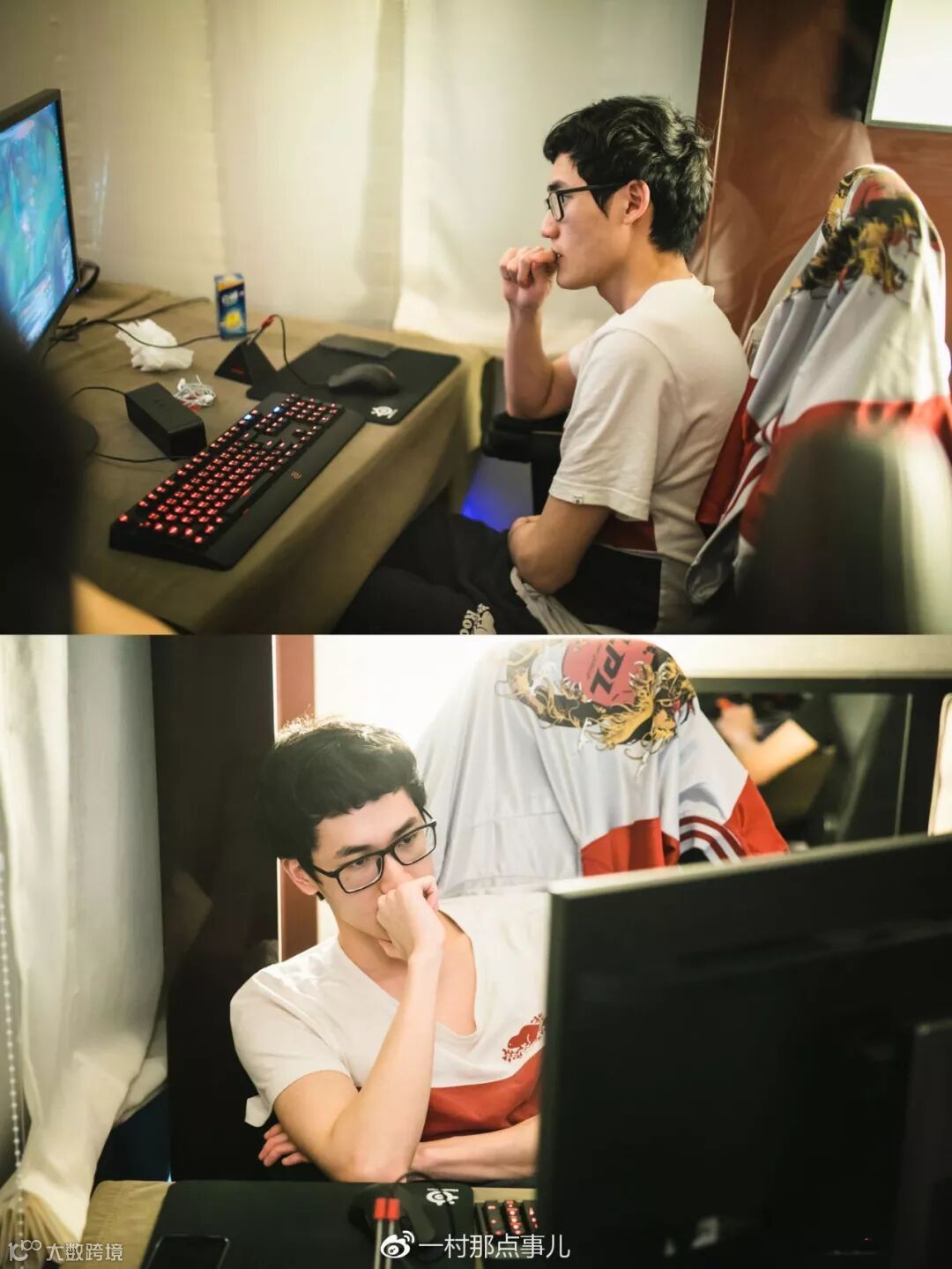 反差最为明显的则是中单选手小虎,在前一秒还一脸疲惫的他,正式开始训练后迅速找回了状态,精神饱满的与队友交流沟通。