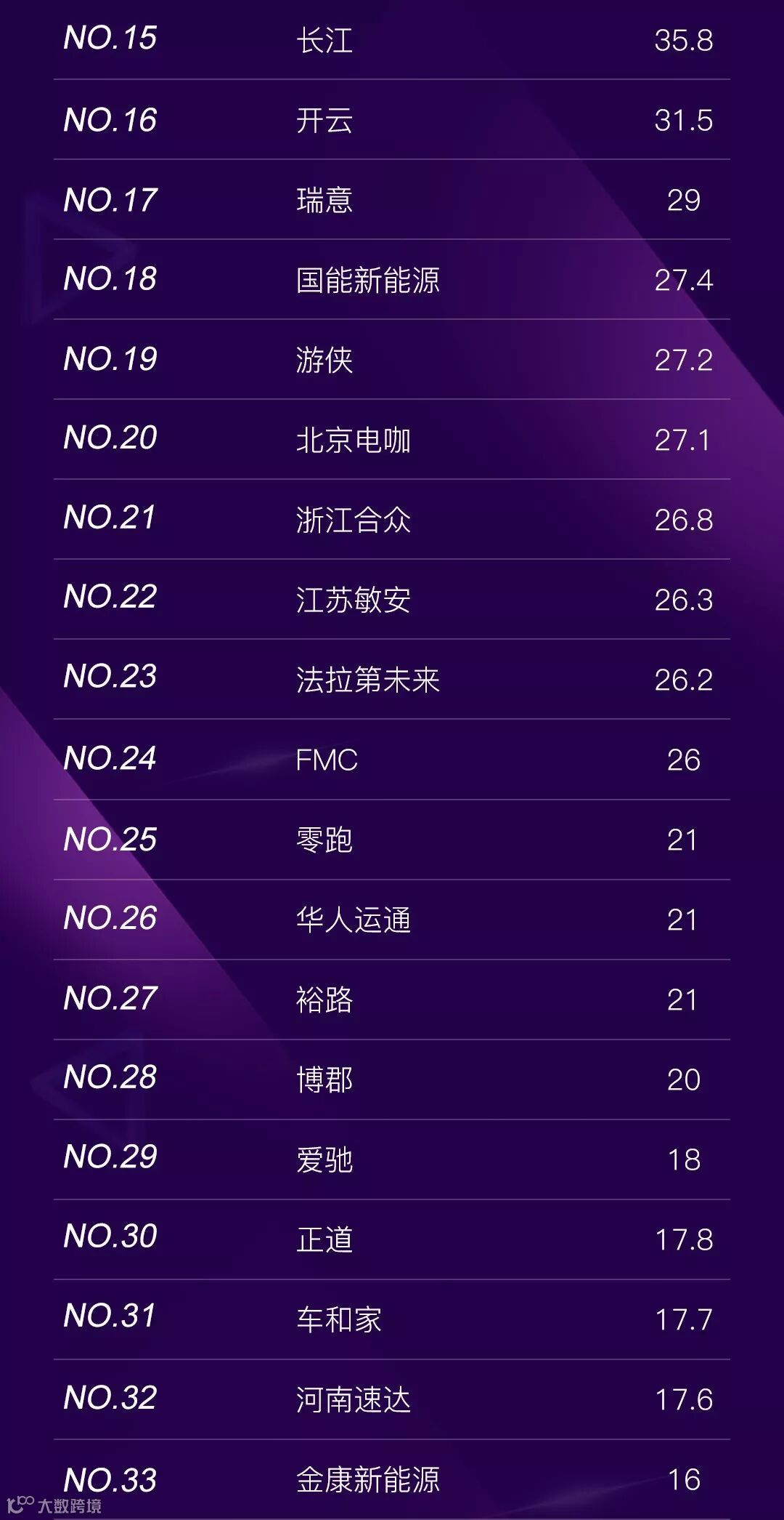 具体的打分细则为融资每10亿元人民币=1分, 也就是说,车企的融资每累计1亿元人民币就能得到0.1分,以此类推,上限为25分,所有达到或超过250亿元融资的车企就能获得25分的单项满分。