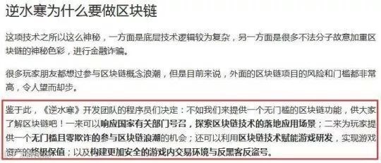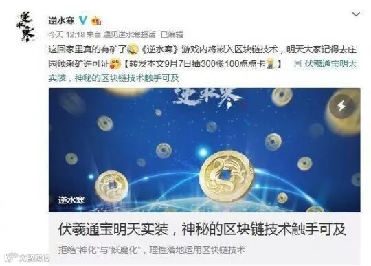 相信各位小伙伴今天都看到了这样一条消息:《逆水寒》中已内嵌区块链技术。