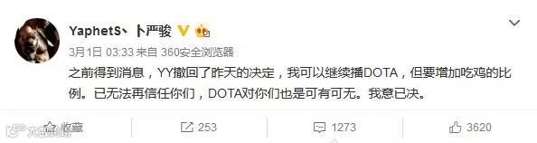 不久后,Pis再次发微博称YY撤回了之前的决定,他可以继续播Dota。但Pis表示“已无法再信任你们,DOTA对你们也是可有可无。我意已决。”