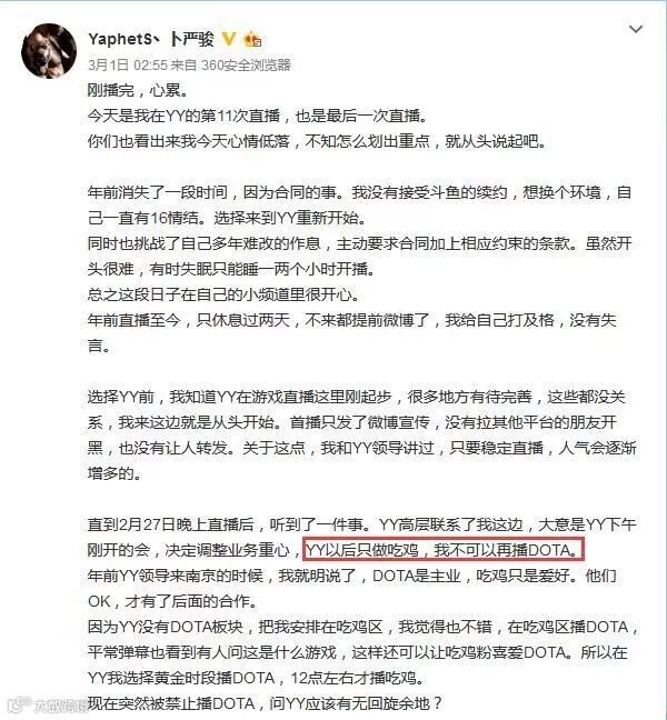 不过现在的Dota早已不复当初的盛况,不仅是普通玩家,就连不少Dota主播都被迫转型。3月1日凌晨,前Dota2职业选手、知名主播Pis在个人微博上发表了一条长文: