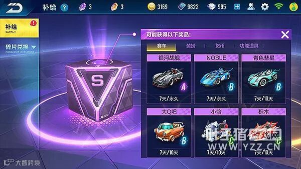 紫色寻宝的消耗品也能通过完成每日任务或者点劵购买获得,有几率获取永久道具,但相对高的几率是拿到"天数"外观和赛车(起码B级),金色寻宝只能通过钻石来购买次数抽~