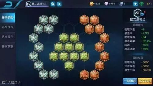 这套铭文蓝色用狩猎,绿色用鹰眼,红色用祸源,整体下来+10%移动速度和攻击速度,其实主要看中的是移动速度,能够使战士的走位更加灵活,而另外的就是+64物穿和32.4%的暴击效果和7.9%的暴击率。