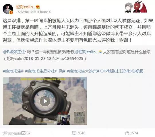 先是up主上传锤蛇哥的视频,我们可以发现在蛇哥23日18点场的录像中,蛇哥先是(瞬镜)瞄准山坡上的敌人,开枪的瞬间准心跳到了下方的敌人头上。就算不玩绝地求生的人也可以看出来,“自瞄”的很是十分明显。
