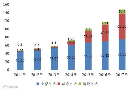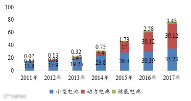 2011-2017年全球不同类型锂电池出货量(GWh)