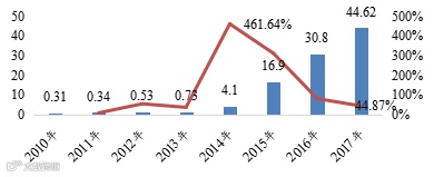2010-2017年中国动力锂电池产量(GWh)及同比增速