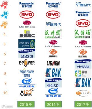 2015-2017年全球动力电池销量前十企业