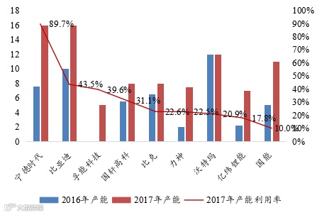 2016-2017年中国主要电池企业产能(GWh)及产能利用率