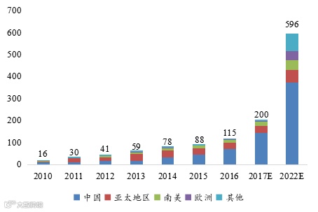 各区域电动汽车和储能锂离子电池产能情况(GWh)