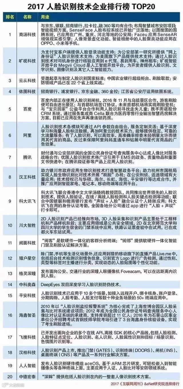 人脸识别:旷视科技、腾讯优图、蚂蚁金服、FaceID、汉王科技、Facethink、思源科安、云飞励天、商汤科技、云从科技、依图科技、百度、阿里、腾讯、科大讯飞、阅面科技、猎户星空、格灵深瞳、中科奥森、平安科技、海鑫智圣、飞搜科技、汉柏智能、人人智能、中德宏泰