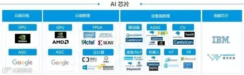 设备端推理:高通(移动端)、深鉴科技(机器人)、寒武纪科技(移动端、CV、机器人)、地平线科技(CV、机器人、语音)、FaceOS(CV)、思必驰(语音)、声智科技(语音)、云知声(语音)、启英泰伦(语音)、耐能(IoT)、NovuMind(IoT)、微软(VR)、华捷艾米(VR)、IBM(类脑芯片)、西井科技(类脑芯片)