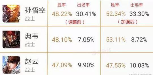 最后再来看看加强了的三位英雄!第一位是猴哥,本次加强以后猴子的胜率直接上升了4个多点,出场率也在逐步上升,目前官博下面又开始声讨猴子了;典韦就更恐怖了,胜率直接上升了5个点;而稍微增强了一点儿的赵云胜率也同样稍微上升~总的来说本次的调整确实收到立竿见影的效果,不知各位在游戏中是否有体会到呢?