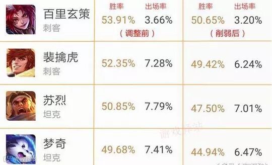 在被削弱的四位英雄中,百里玄策的胜率掉了接近3.5%,裴擒虎几乎下跌了三个百分点,同时被削的苏烈也一样。但最惨的莫过于梦奇同学,胜率下跌了5%,排位胜率下降到了倒数!
