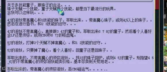 “一技能也可以拿来合4技能泪妖。。珠子只要一个c66就不管了。直接连,反正每个珠子都有使用方法。多认识东界五开,泪妖可以长期供货给你。。3技能辣鸡30级童子也可以供货给你,你也可以找东界五开帮你连珠子。。反正楼主区的价格,20万收没高魔心30泪妖,30万收带高魔心30泪妖,25万收3技能30童子。。20万一只请人帮连珠子。。 可以这么说,我们鬼区东街几个队伍的点卡,都是我包的。”