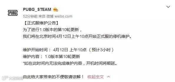 《绝地求生》官博今天连续发出两条动态,宣布游戏在10点开始进行为期三个小时的1.0版本第十轮维护啦!