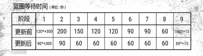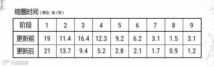 上图可见,毒圈出现时间从原来的420秒(7分钟)缩减为390秒(6分半),第一次缩圈时间从原来的200秒(3分20秒)骤减至90秒(1分半)。并且从第二次缩圈开始,每一次缩圈的时间都固定为一分钟。