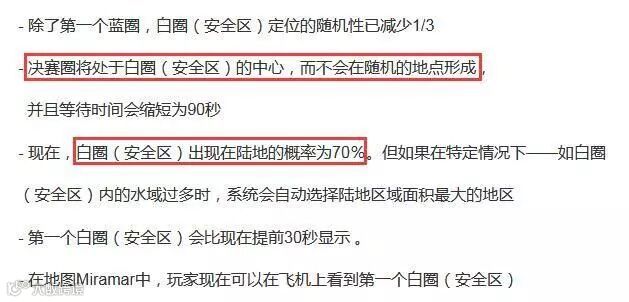 除了上述这些改动外,白圈(安全区)也得到了相应的调整。更新后的安全区会有70%的概率出现在陆地上,而且决赛圈现在会固定刷新在最后一个白圈的中间位置,而不是随机出现。