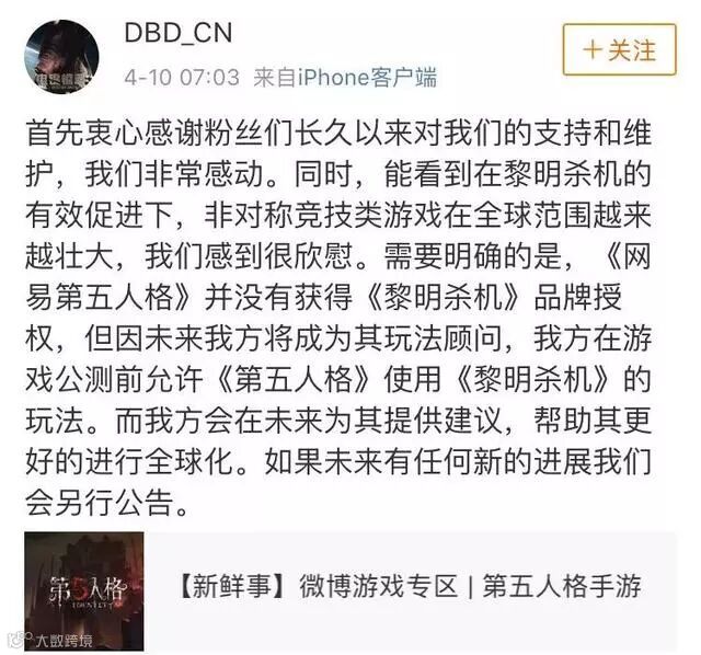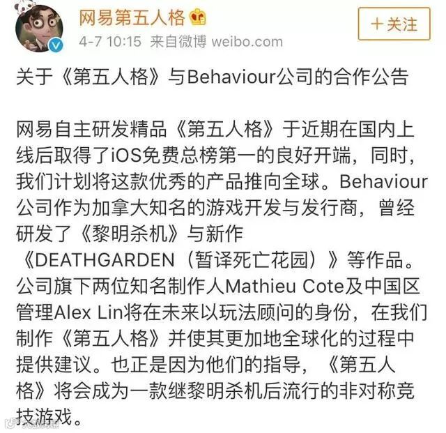在引起网友热议之后,《第五人格》官方微博迅速发表了《黎明杀机》的制作方Behaviour公司两位制作人将以顾问身份为《第五人格》全球化提供指导这样的声明。
