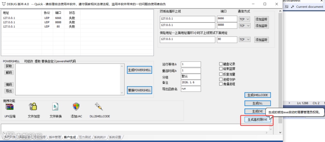 对比一下生成的普通被控exe,新的类型的exe生成时就带有盾牌图标且运行时自动请求管理员权限了。来看下效果:
