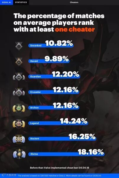 在过去,GOSU AI报告曾经指出DOTA2中有12%存在开挂现象。而且,他们还发布了一个各分数段开挂比例。从下图能够看得出,低端局中开挂现象较少,越往上开挂现象就越严重。