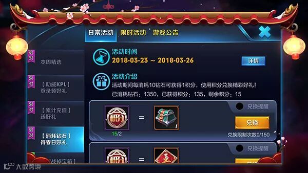 言归正传,这次钻石消耗活动的持续时间是3月23日至26日。这里不得不提一个小窍门——按照惯例,活动的结束时间当日的23:59,然后3月26日是下周一。喜欢钻石夺宝的话,如果条件允许请留出72次夺宝的消耗(约4000钻石),等待下周的奖励刷新。