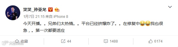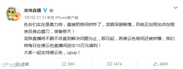 就在昨晚德云色准时开启了在龙珠的第一次直播,不过在刚刚开播不久就出现了意外状况:大批德云色色友集体进入直播间,竟然导致平台被挤爆,随后笑笑也在微博公布了事故原因。