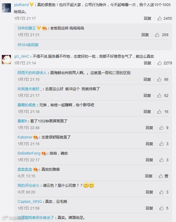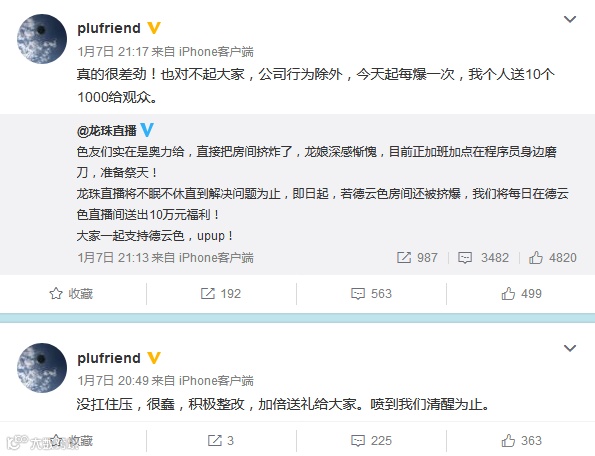 随后,龙珠官博以及CEO也出面在微博上和观众道歉,并表示将会“不眠不休直到解决问题为止”: