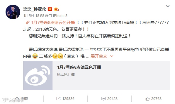 在与斗鱼结束了长达三年的合同后,LOL人气主播笑笑和西卡的去向成为了不少观众最关心的话题。直到1月5日晚,笑笑表示德云色将正式加入龙珠TV直播,并预告了1月7日晚将会开播的信息。