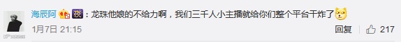对此有不少网友调侃道:“龙珠怕是这辈子没见过这么多观众!”,还有网友称“三千人小主播就给你们整个平台干炸了”,疑似调侃德云色老东家打压人气。