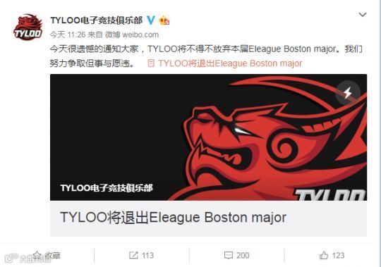 近日,TYLOO电子竞技俱乐部宣布将放弃本届Eleague Boston major。天禄官方微博也在今日公布了声明,对本次退赛的原因做出了详细解释。在声明中天禄称已经努力争取但事与愿违,表示由于BNTET签证没有通过,按照规则只能有替补Peacemaker上场,最开始Peacemaker也同意了上场的请求。