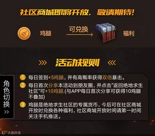 而社区商城的专属货币是“鸡腿”,商城福利所需的兑换数量尚未确定。目前玩家可以通过每日签到和活动分享领取“鸡腿”,预计以后会增加更多的获取渠道。