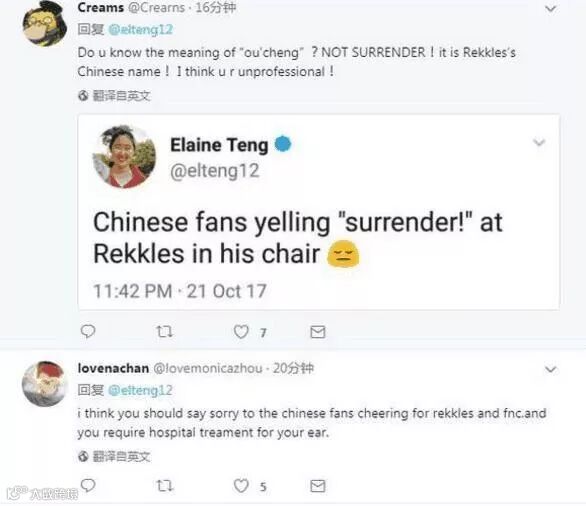 lovenachan:我觉得你必须向所有为Rekkles和FNC加油的中国粉丝道歉,而且你需要去医院看看你的耳朵了。