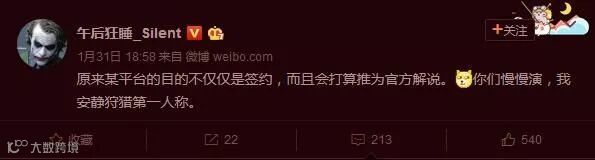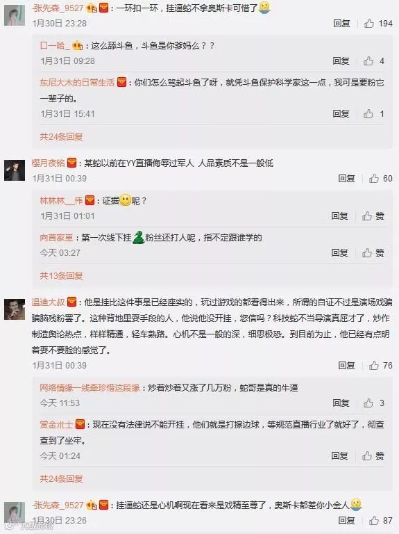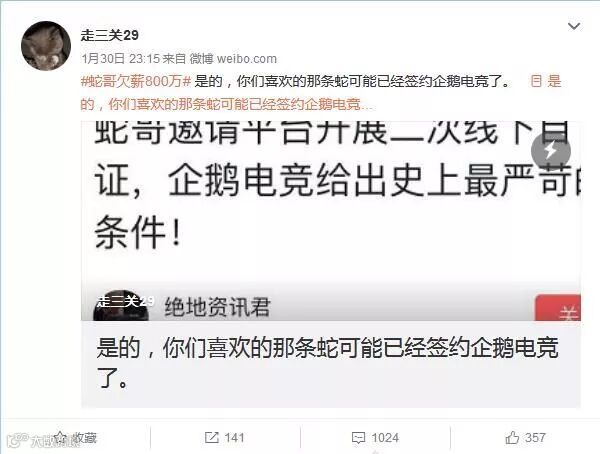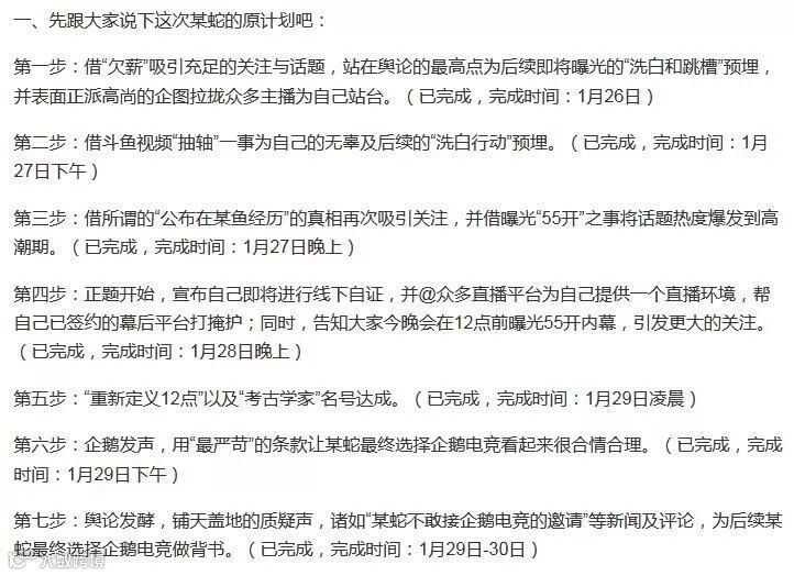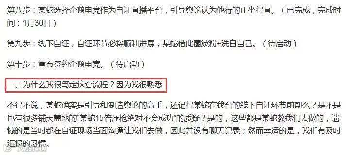 这位超管表示蛇哥现在的做法是“利用斗鱼教他的方式来对付斗鱼”,并在1月30日晚发微博称他很快就会签约企鹅电竞,而且在长文中还曝光了不少蛇哥的手段细节和步骤。