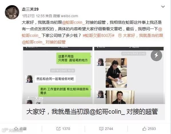在蛇哥开撕斗鱼后不久,有位声称自己是当初签约蛇哥的斗鱼超管站了出来,并且在微博上diss蛇哥: