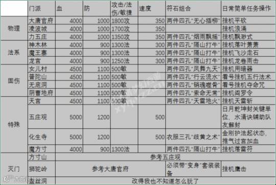 其中“力五庄”指加力量当物理系用的五庄观,“五庄观”指普通的体耐敏加点的五庄观。“魔方寸”指加魔力当法系用的方寸山,“方寸山”指普通体耐敏加点的方寸山。不能挂机的门派在简单任务中会被嫌弃,经常要自己当队长。当队长不一定是坏事,因为你可以挑队员。