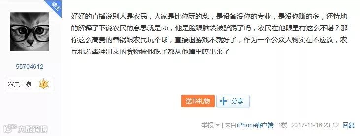 有网友发帖表示:“人家是比你玩的菜,是设备没你的专业,是没你赚的多,那你这么高贵的香锅跟农民玩个球,直接退游戏不就好了?”