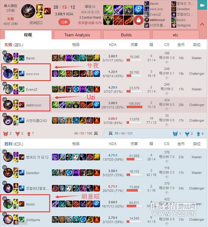 上图可见,兮夜和小狗排在同一队,而EDG的新AD选手胡显昭则排在对方。在这一场比赛中小狗和Mata的下路组合全程表现都非常不错,眼看着即将胜利,但在最后一波团战中Uzi走位失误被对方机器人勾中击杀,因此导致被对面一波翻盘。而在失败后,直播中的兮夜吐槽小狗的走位不好,一波团战居然能吃机器人好几个Q。