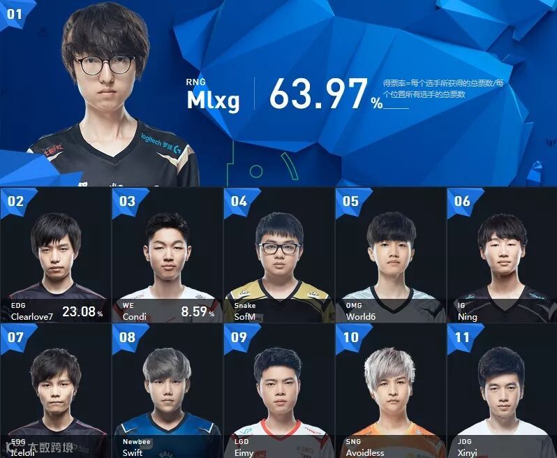 至于打野方面,目前RNG-Mlxg同样以63.97%的得票率稳居第一,第二名的厂长得票率则仅有23.08%。而排在第三至第五名的则分别是WE-Condi、SS-SofM和OMG-World6。