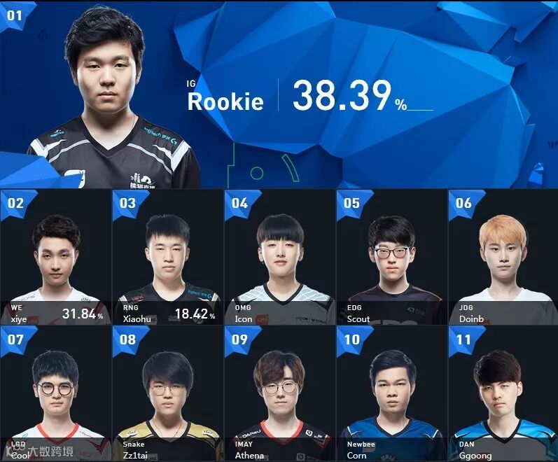 相比起上野位置来说,中单位置的得票率差距是最小的,虽然目前IG-Rookie以38.39%的得票率位居第一,但WE-Xiye以31.84%的得票率紧随其后,随时都有可能反超。而排在第三至第五名的则分别是RNG-Xiaohu、OMG-Icon和EDG-Scout。