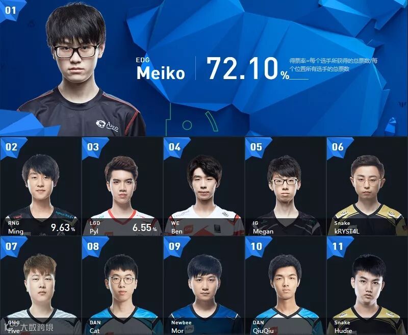 至于辅助位相信结果大家也都能预料到,虽然今年的S赛上EDG表现非常差,但这丝毫不影响Meiko成为LPL赛区最有人气的辅助。截止目前,Meiko以72.10%的得票率稳居辅助第一,排在第二和第三的分别是RNG-Ming和LGD-Pyl。
