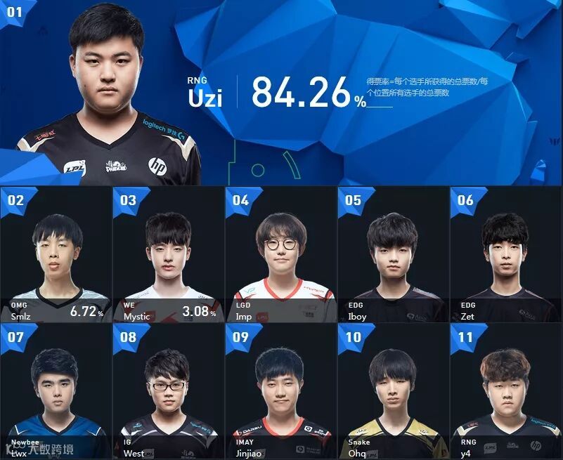 在2016年时,虽然在世界赛上EDG同样止步八强,但同样以四万多票的优势领先,得票率达到了惊人的50%,仅比Uzi的51%低了一点点。