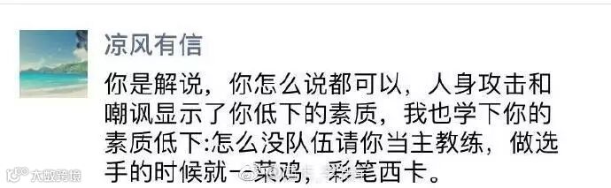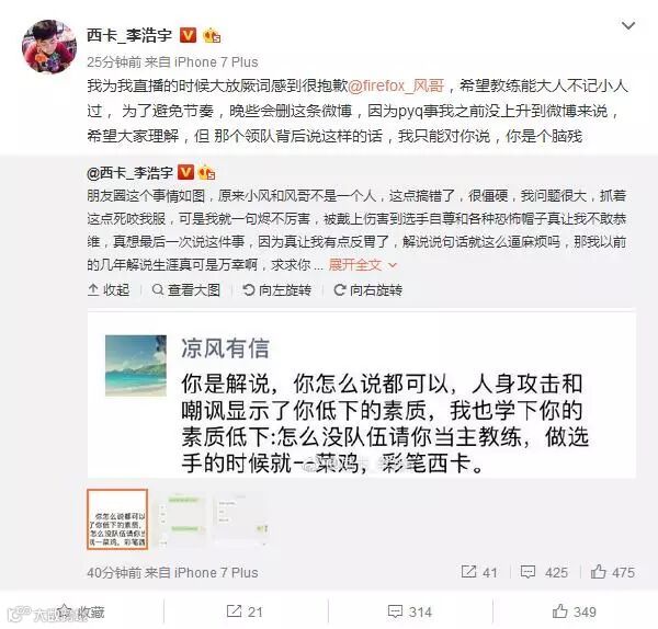 根据西卡微博中的配图来看,之前那位在洲际赛期间喷他的“凉风有信”并非RNG教练风哥,而是RNG的领队: