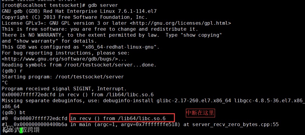 因此,server 端也会一直没有输出,如果你用的是 gdb 启动 server,此时中断下来会发现,server 端由于没有数据会一直阻塞在 recv 函数调用处(55 行)。