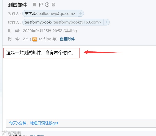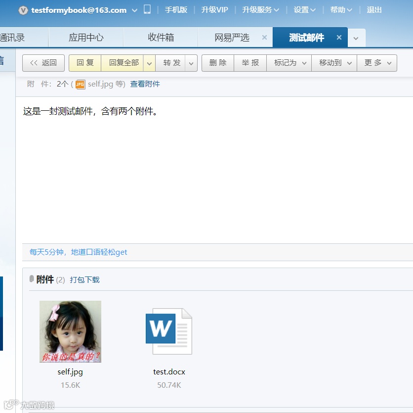 上述邮件的主题是“测试邮件”,内容是纯文本“这是一封测试邮件,含有两个附件。”,还有两个附件,一张名为 self.jpg 的图片,一个名为 test.docx 的文档。我们将邮件下载下来后得到邮件原文是: