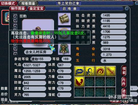 属性面板:4432气血,2968命中,2125伤害,916防御,340速度(貌似没穿衣服,估计都是辣鸡装备吧,没有太大参考意义)