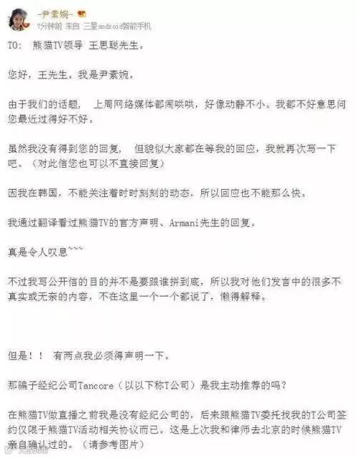 6月26日晚,传闻被熊猫TV以2000万元签下的韩国“直播一姐”尹素婉通过个人微博向王思聪发出了一封公开信。