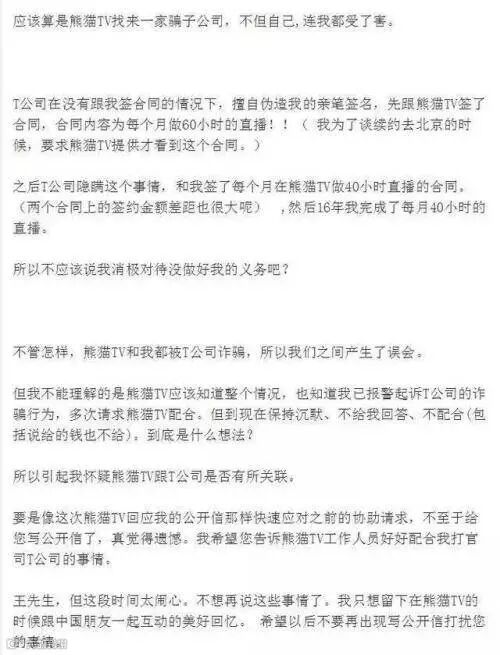 文中,她控诉王思聪没有遵守其只在熊猫TV做直播的前提下支付经济补偿金的承诺,并透露很多网红都曾遭受此不公待遇。同时,直指熊猫TV恶意扣留其粉丝礼物,并要求其归还。