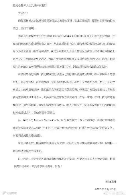 对此,26日晚间同时,熊猫直播通过官方微博进行回应,称此前与尹素婉的经纪公司已签署了商业合同,在合同有效期内熊猫直播合理履行义务,未出现违约行为。熊猫直播表示尹素婉在合同期的约定直播量不足70%,消极对待合同规定的应尽义务。
